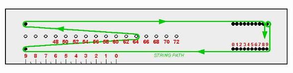 OK, lets say you have a 50 lb longbow, so we're going to make a 12 strand string. For a two ply string we'll need two bundles of 6 strands each or three bundles of 4 strands each for a three ply string. Grab you string jig and tie the end of the B-50 dacron string to the top left-hand nail as shown in Figure 2. If your bow is 64 inches long, put the movable peg in the hole marked 64 and start winding the strands onto the jig until you have 6 strands of string on the jig. Cut the strands with a sharp knife or razor blade right down the center line between the top nails.